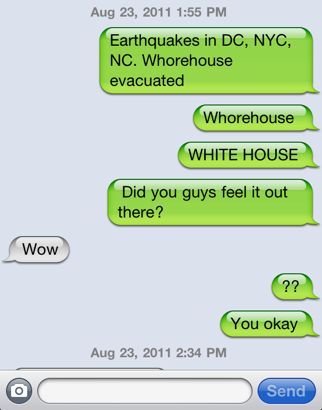 My first instinct when I heard about the DC-VA-NYC Earthquake was to text my daughter who is away at college in the eastern part of NY State. The Gospel According to Twitter seemed to indicate that people from North Carolina to Boston were reporting tremors, so it seemed reasonable to check on her. My iPhone may have misinterpreted my intent: