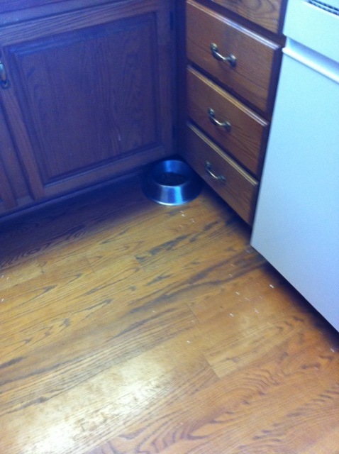 The Cornered Dish. This move requires navigating a corner, then shoving the bowl 3-4 feet into this corner. Note please that the bowl is full, so this dog dish shuffleboard is not caused by enthusiastic chowing down.