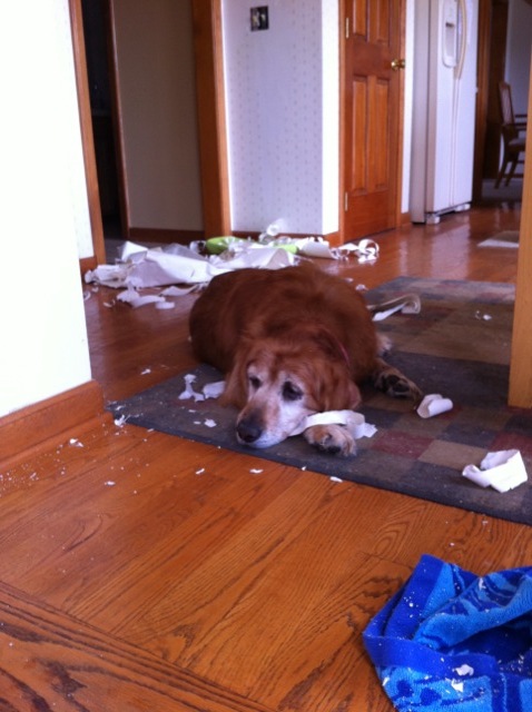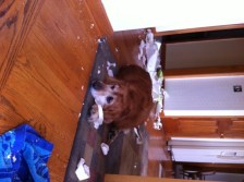 Sharkdog is taking a break from Doghenge to help us strip the kitchen wallpaper. My husband saw her and wanted to clean the wallpaper scraps off of her. I wanted to take a picture. So if you ever watch America’s Funniest Home Videos and wonder who sees their kid fall off a swingset and break their arm and grabs a video camera instead of taking them to the hospital, now you know.