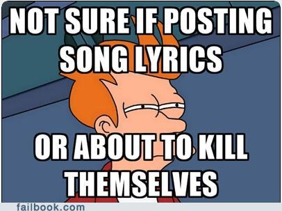 I am pretty much a cheerful, upbeat person, but all my favorite lyrics make me sound like a petulant teenager or a disgrunted postal worker. Examples in no particular order: