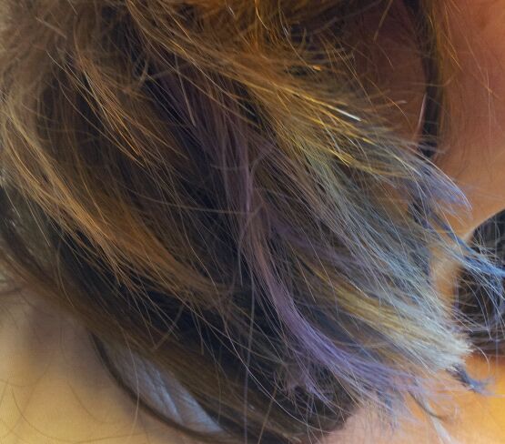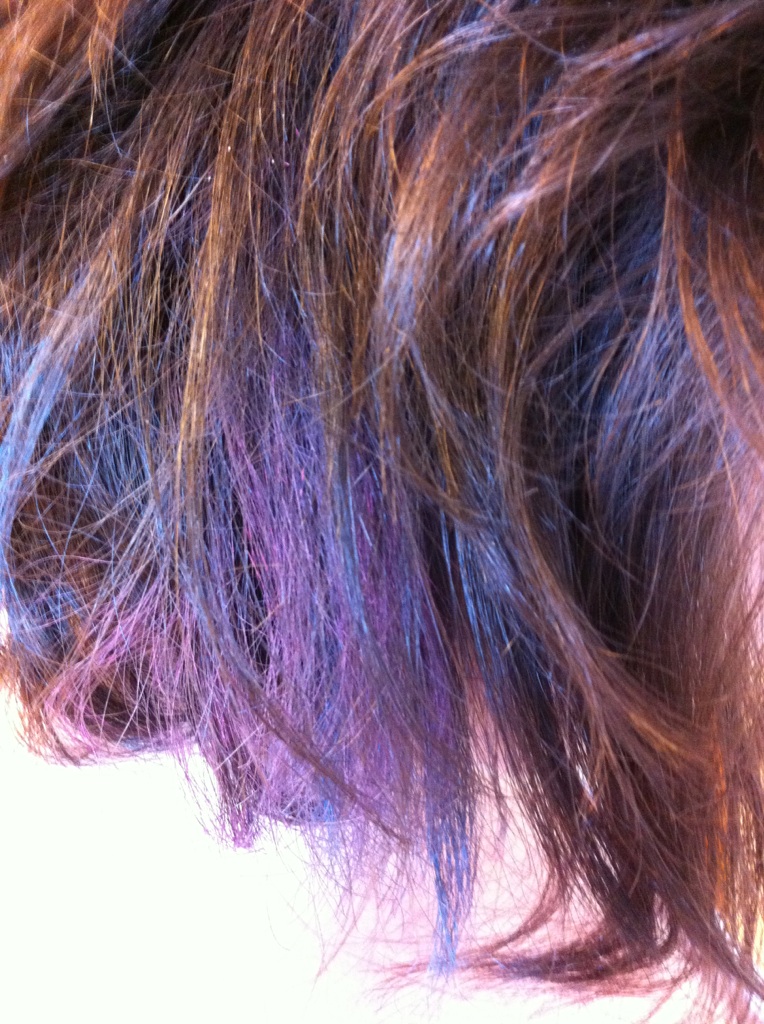 We wanted to chalk under layers, so we clamped up the top hair layer. Then we chose colors. I picked two shades of blue and a purple, she chose pink and blue.