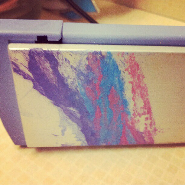 We started with small sections of hair, about 1/2 an inch or so. Sprayed it with water, then took one of the chalk colors and ruined it up and down along the strand. We had to rub pretty hard to get good coverage. Then we set it by clamping a flat iron onto the chalked area.